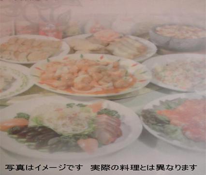 1.前菜四種盛り合わせ 8.豚肉の角煮 2.海鮮炒め 9.えびチャーハン 3.春巻きと若鶏の唐揚げ 10.コーンスープ 4.牛肉のオイスターソース炒め 11. 二種点心セット 5.酢 豚 12. 焼き餃子 6.四川風野菜炒め 13.北京ダック(サービス) 7.ねぎとイカ炒め |