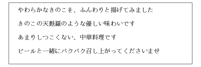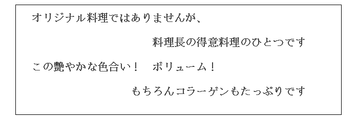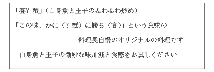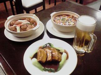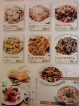 1.前菜三種盛り合わせ 7.五目チャーハン 2.海老のチリソース 8.玉子とトマトスープ 3.若鶏の唐揚げ 9.杏仁豆腐 4.鶏の胸肉甘酢あんかけ 10. 二種点心セット 5.野菜炒め 11. 北京ダック(サービス) 6.青椒牛肉絲 |